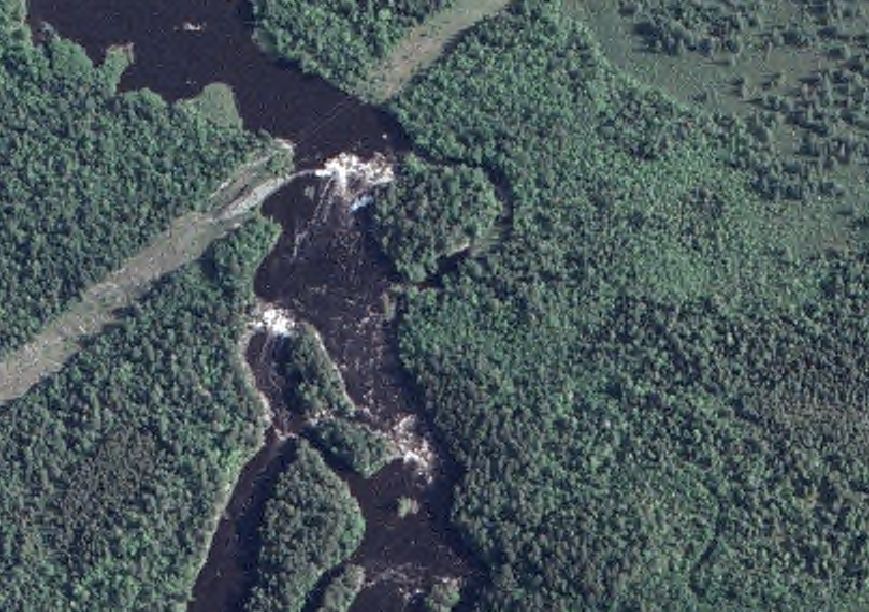 All of the 2004 MrSID county files on this page are an interim version. They are 2-meter resolution, so they will not be as detailed as the one-meter resolution photos available for 2003 (on the plus side, the files are much smaller). To compare, click on the example photos below, each showing the same area of rapids along the St. Louis River in Carlton County (note that the color balance was also different for the different years).
