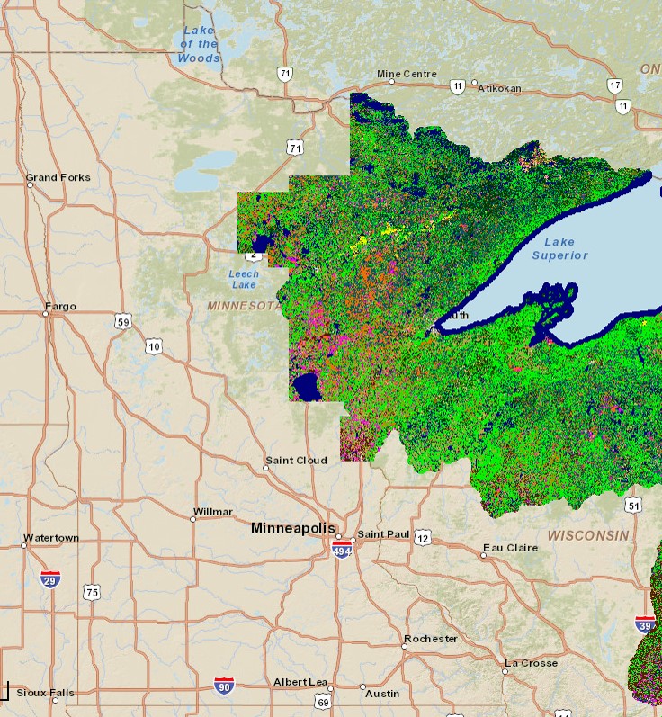 - Duluth and Rochester (2015): 1-meter raster dataset created using a combination of 2015 FSA NAIP data, LiDAR, and other datasets, using object-based image analysis.