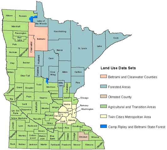The following maps and data sets cover various regions of Minnesota. They are more detailed than the state inventories described above. See a map of areas covered by each data set. Also check county websites for planned land use or zoning maps.- Agricultural and transition counties (1988-90)