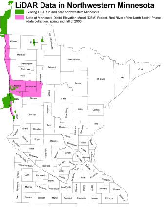 - lidar_status_nwmn.pdf: Status map showing existing LIDAR data in and near northwestern Minnesota as well as the area covered by the Red River of the North Basin, Phase I