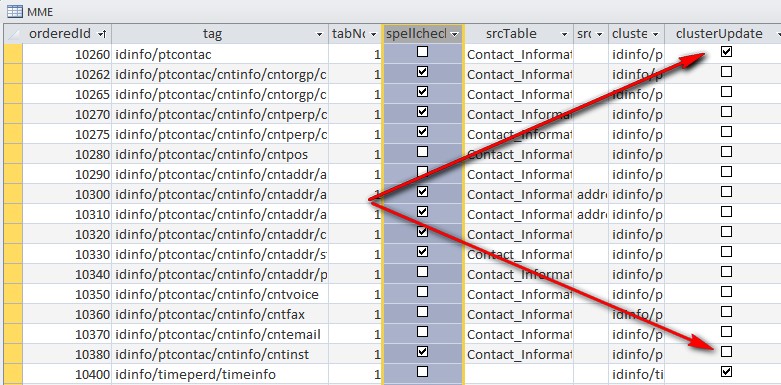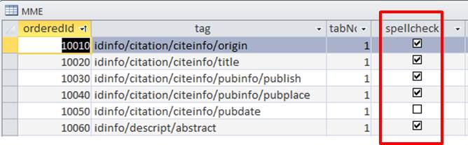 The MME table contains a column for specifying which fields are searched when a user spell-checks a metadata record. This field is called spell-check. This field can be enabled (checked) or disabled (unchecked) for each element in the MME user interface. Fields that have the spell-check field checked (enabled) will be included when the spell-check feature is used from the MME user interface. By default, most free-text fields are set for spell-check.